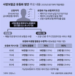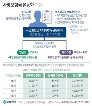 사망보험금 연금전환 제도는 사망보험금 유동화의 확장형 제도다. 기존에는 사망 후 유족이 일시금 형태로만 수령할 수 있었으나, 이제는 55세 이상 종신보험 가입자가 사망보험금 일부를 연금처럼 분할 수령할 수 있다. 2025년 10월부터 연 지급형이 우선 도입되고, 2026년 초에는 월 지급형도 출시될 예정이다.