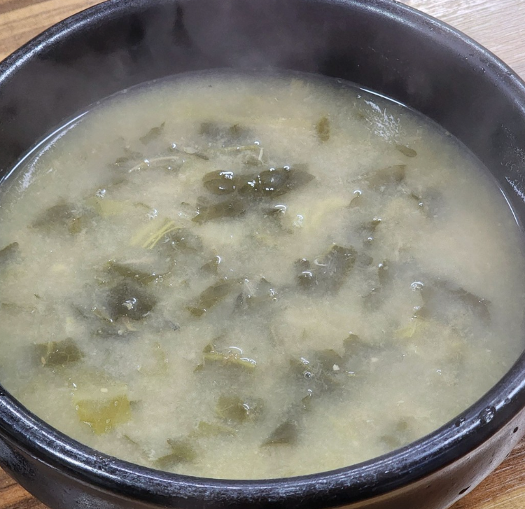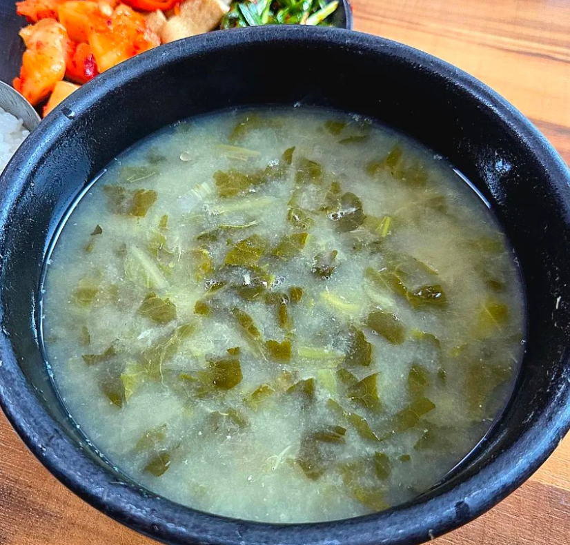 이 집 시락국은 우리가 흔히 아는 시래깃국과는 차원이 달라요. 흰살생선(혹은 장어)을 가마솥에 푹 고아낸 육수에 된장을 풀어 넣어 구수하면서도 깊은 감칠맛이 폭발합니다. 부드럽게 삶아낸 통영 시래기가 듬뿍 들어가 있어, 국물 한술 뜨자마자 "아, 이게 통영의 아침이구나!" 싶더라고요.