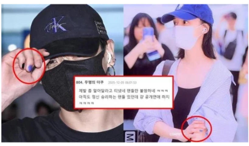이와 함께 비슷한 스타일의 반바지, 슬리퍼, 팔찌, 인이어 디자인 등이 반복적으로 포착되며 ‘커플 아이템’ 분석이 빠르게 확산됐다. 특히 정국과 윈터가 하루 차이로 약지에 네일을 한 정황까지 알려지면서 열애설은 단순 추측을 넘어 ‘정황증거’ 수준으로 팬덤 사이에서 소비됐다.
