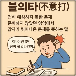 불의타 뜻은 불의의 일격이나 급습을 가리키는 말로, 사전에 대비하지 못한 상황에서 갑작스럽게 가해지는 공격을 의미한다. 일상 회화에서는 거의 쓰이지 않으며, 주로 법률·사법 절차나 시험·수험 분야에서 전문 용어로 사용된다.