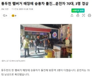 26일 오후 1시쯤 경기 동두천시 지행동에 위치한 한 햄버거 매장으로 승용차가 돌진하는 사고가 발생했다. 70대 남성이 몰던 차량은 매장 앞에 주차하던 중 갑자기 속도를 내며 유리 벽을 들이받았고, 그대로 매장 내부까지 밀고 들어왔다.