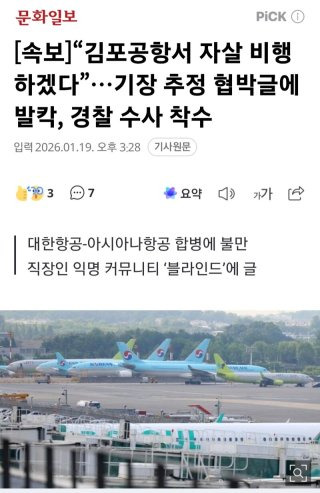대한항공과 아시아나항공 합병에 불만을 품은 항공기 기장 추정 인물이 김포공항을 특정해 ‘자살 비행’을 암시하는 협박성 글을 온라인에 게시해 경찰이 수사에 나섰다. 19일 항공업계와 경찰에 따르면 이날 오전 직장인 익명 커뮤니티 ‘블라인드’에 김포공항 국내선 활주로 좌표를 표시한 뒤 자폭을 예고하는 내용의 글이 올라왔다는 신고가 접수됐다.