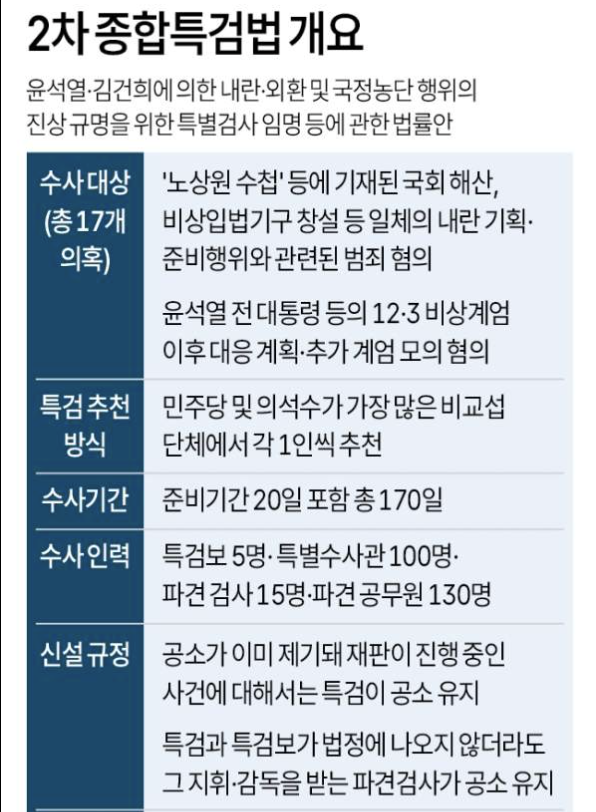 이는 기존 특검에서 결론이 나지 않았거나 수사 과정에서 새롭게 제기된 사안들이다. 법안에 따르면 특별검사는 더불어민주당과 조국혁신당이 추천한 후보 가운데 대통령이 1명을 임명하는 방식으로 선출된다. 수사 기간은 준비 기간 20일을 포함해 최장 170일로, 사실상 반년 가까이 대규모 수사가 이어질 전망이다.