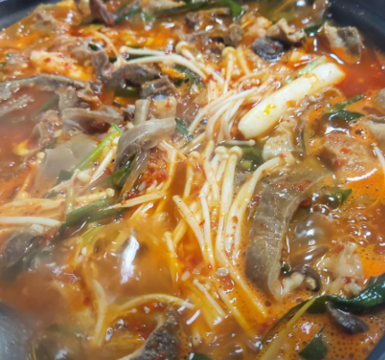 마무리로 나오는 내장전골은 얼큰하지만 텁텁하지 않고, 사골 베이스라 깊이가 있습니다.