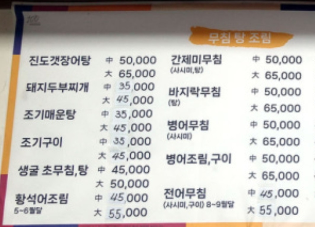 | 생굴초무침 약 45,000원 (중) 낙지호박초무침 약 60,000원 (중) 진도갯장어탕 약 50,000원 (중) 병어조림 조기매운탕 홍어 등 |