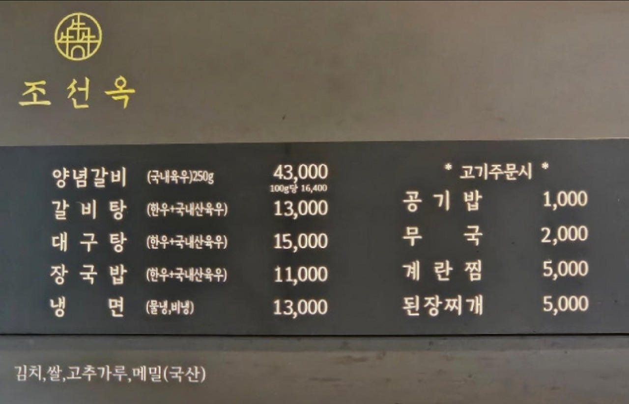 | 양념소갈비 (250g) 43,000원 평양냉면 13,000원 대구탕 15,000원 갈비탕 13,000원 장국밥(경상도 소고기무국) 11,000원 |