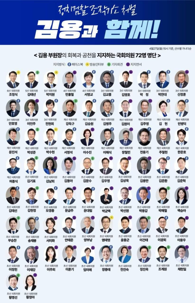 김용 민주연구원 부원장의 정치 복귀 가능성이 거론되면서 더불어민주당 내부에서는 공천 요구가 확산됐다. 특히 친명계 중심으로 공개 지지가 이어졌고, 무려 70명 이상의 의원들이 출마 필요성을 언급하며 힘을 실었다.