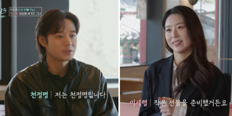 천정명은 tvN STORY 예능 프로그램 '이젠 사랑할 수 있을까'에서 첫 만남을 가졌다. 두 사람의 첫 만남은 봄바람이 부는 따뜻한 날씨 속에서 교외로 나들이를 떠나는 형태로 이루어졌다. 이 만남은 처음부터 설렘 가득한 분위기로 진행되었으며, 진심 어린 인사와 눈빛 교환이 이어졌다.